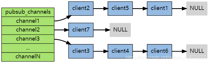 每个 Redis 服务器进程都维持着一个表示服务器状态的 redis.h/redisServer 结构, 结构的pubsub_channels 属性是一个字典, 这个字典就用于保存订阅频道的信息,其中,字典的键为正在被订阅的频道, 而字典的值则是一个链表, 链表中保存了所有订阅这个频道的客户端。